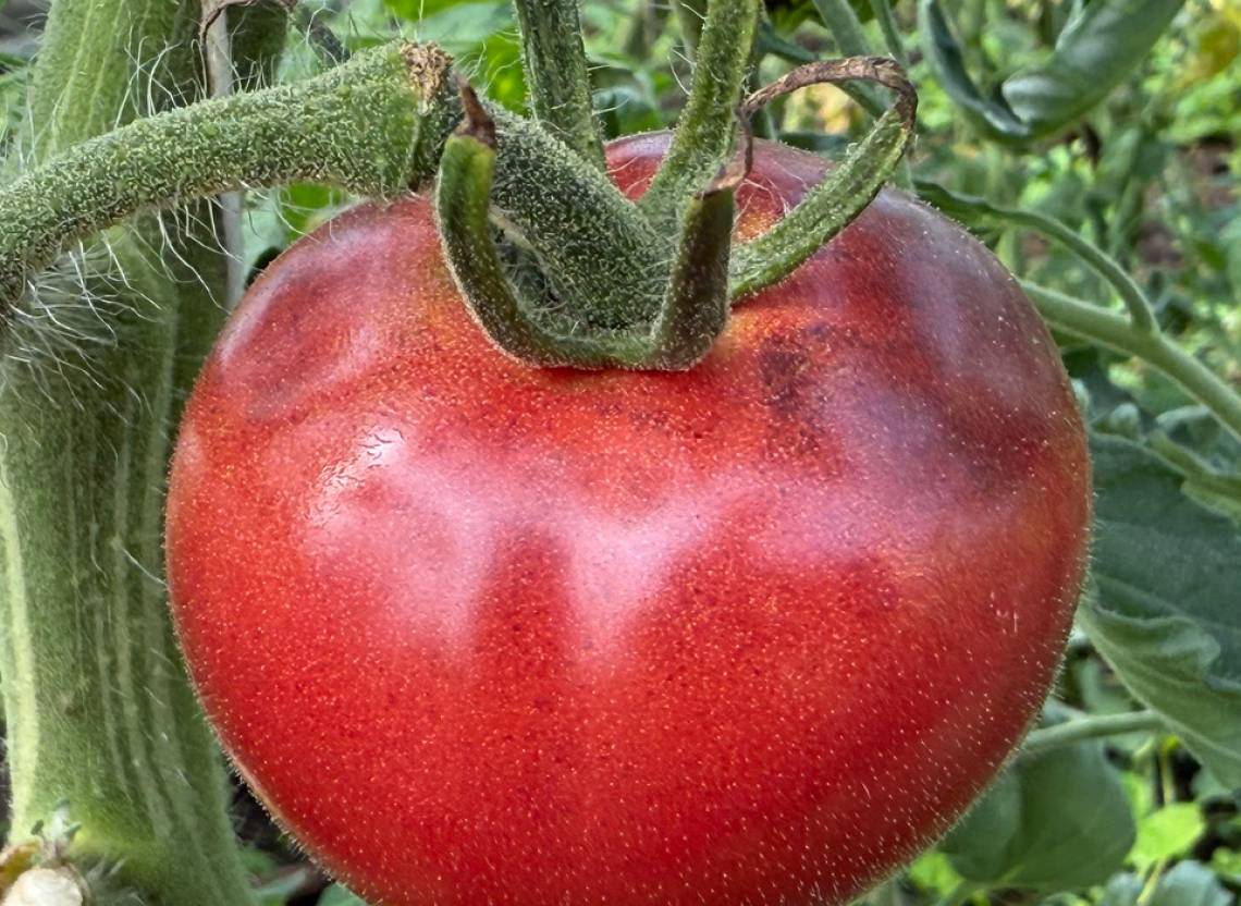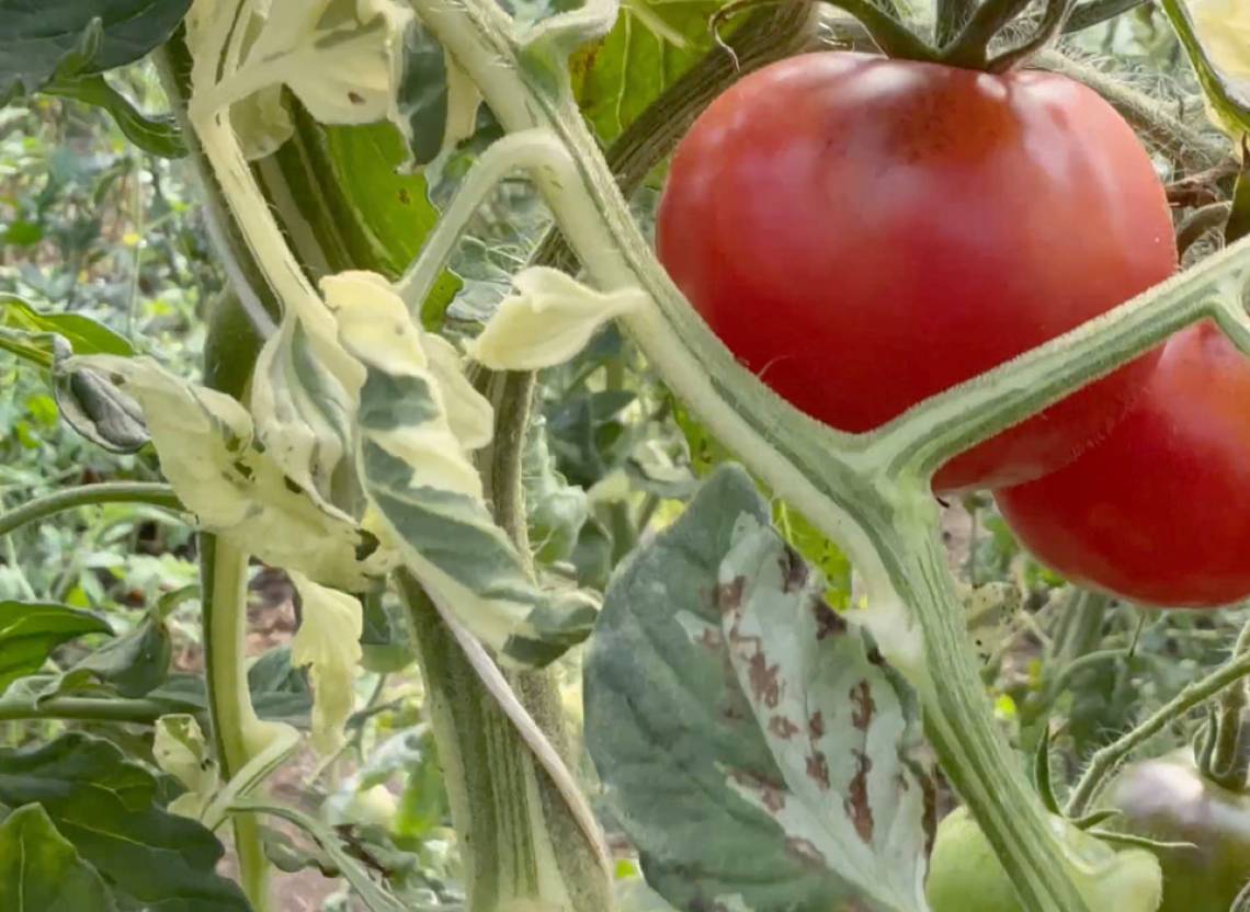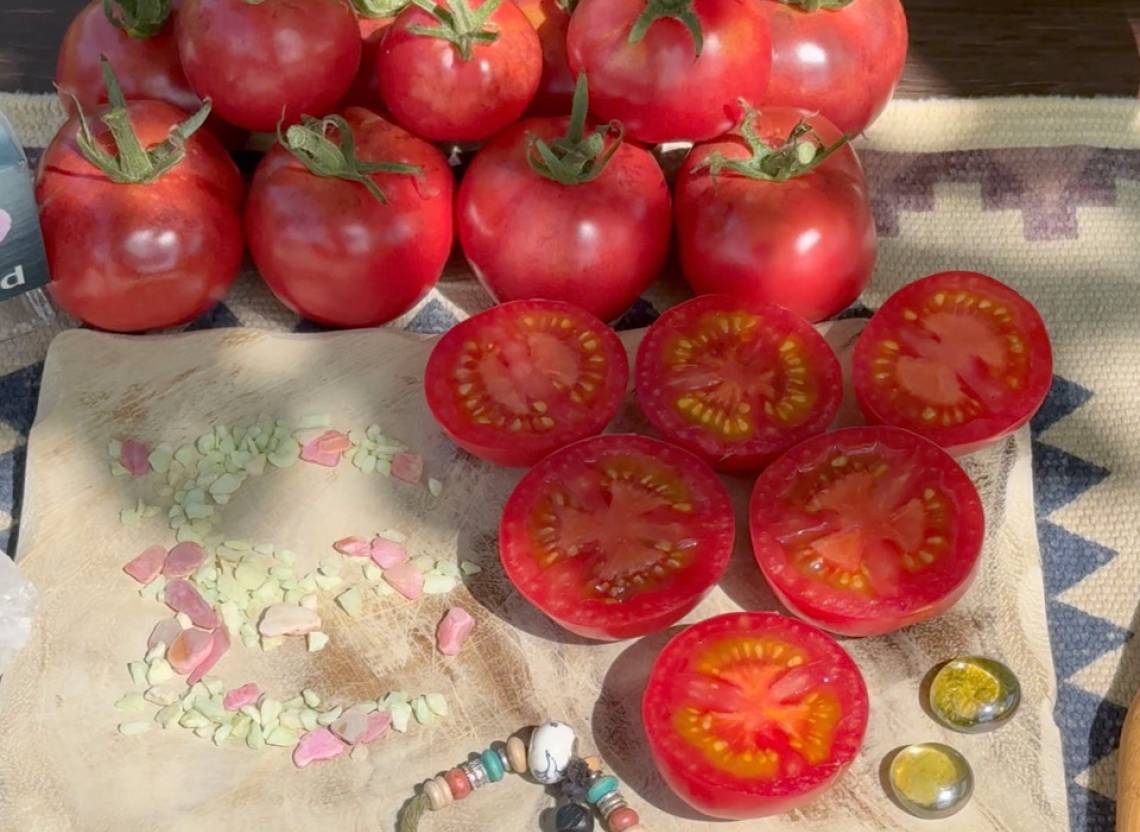 Planta delicada con hojas pequeñas y variegadas. Visualmente muy llamativa. La planta se poda menos que los tomates de hojas verdes. Se recomienda cultivar esta variedad en un lugar protegido, por ejemplo, en una pared soleada de la casa. Los tomates sorprenden por su sabor extremadamente delicado y dulce. Los frutos también te encantarán por su piel muy brillante. A pesar de su brillo, no es firme. Tiene un buen rendimiento. En el plato, los demás tomates palidecen junto a esta brillante belleza. En sus hombros hay un toque de color violeta. Su sabor exótico y fresco con una consistencia cremosa es único.